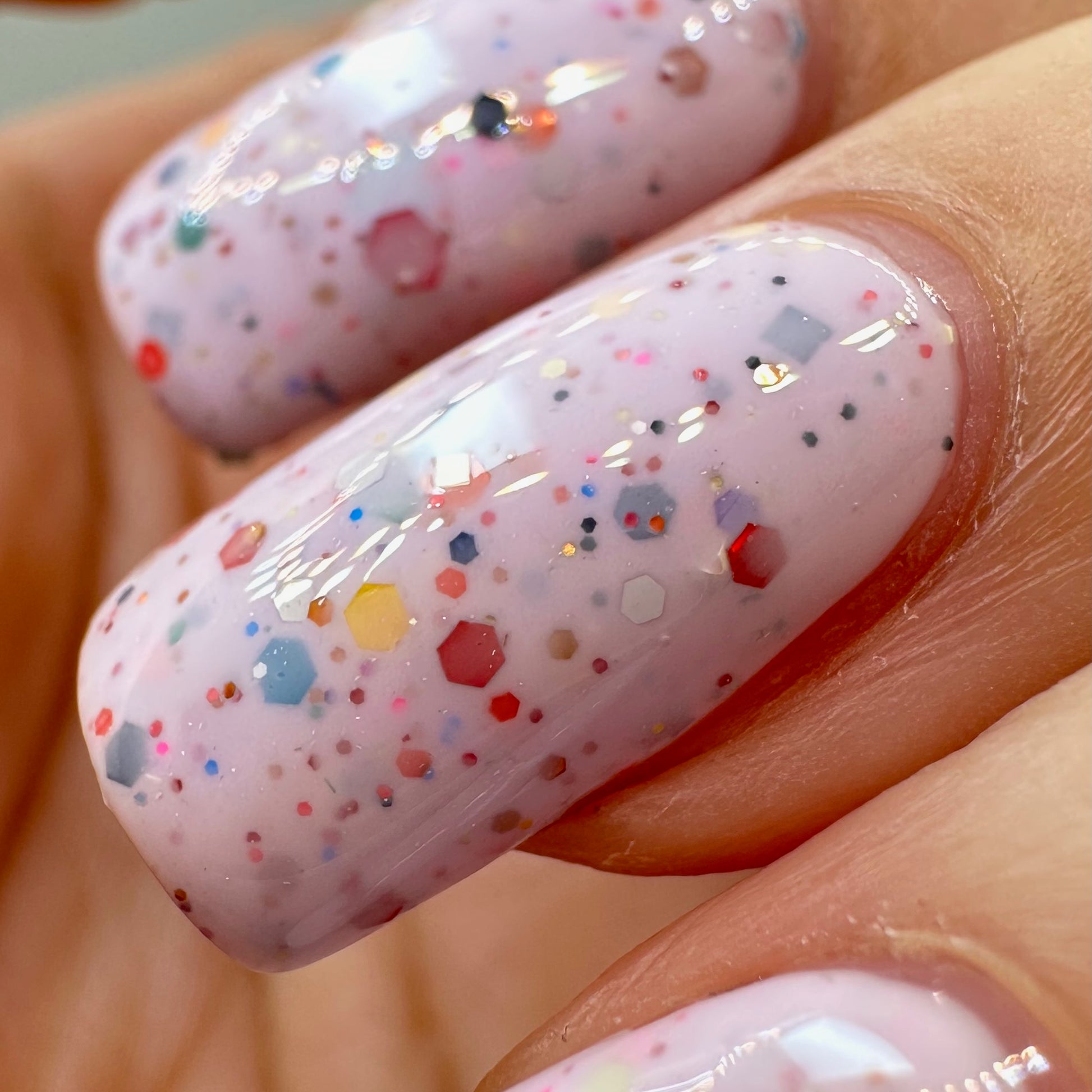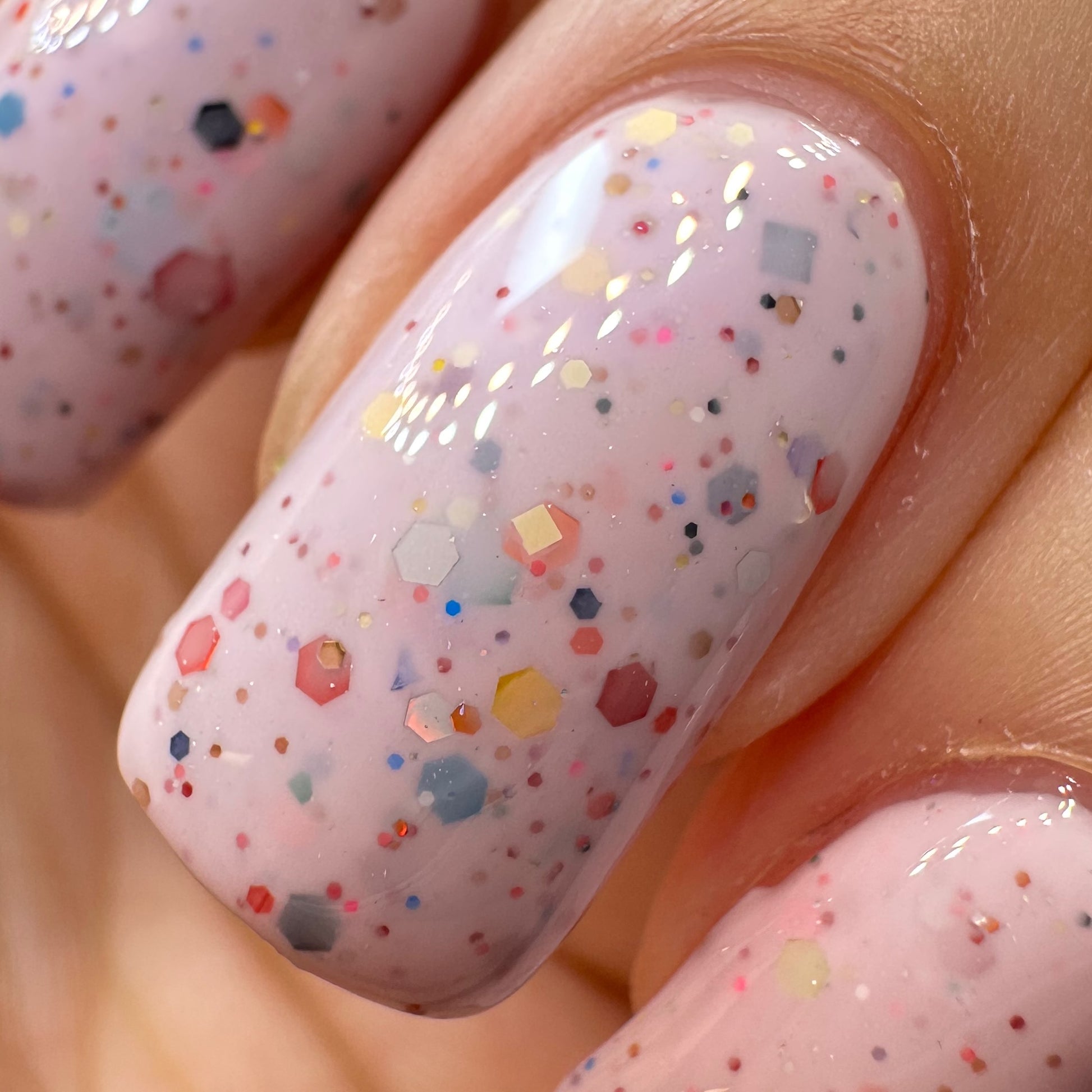 Light pastel magenta crelly based polish with glitters all of colours, shapes and sizes. Mostly Matte glitters with a scattering of holographic smaller glitters.