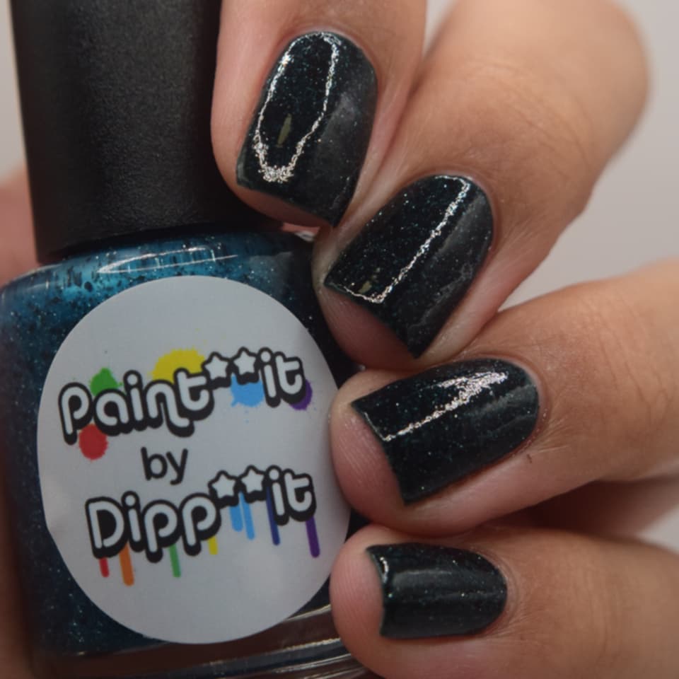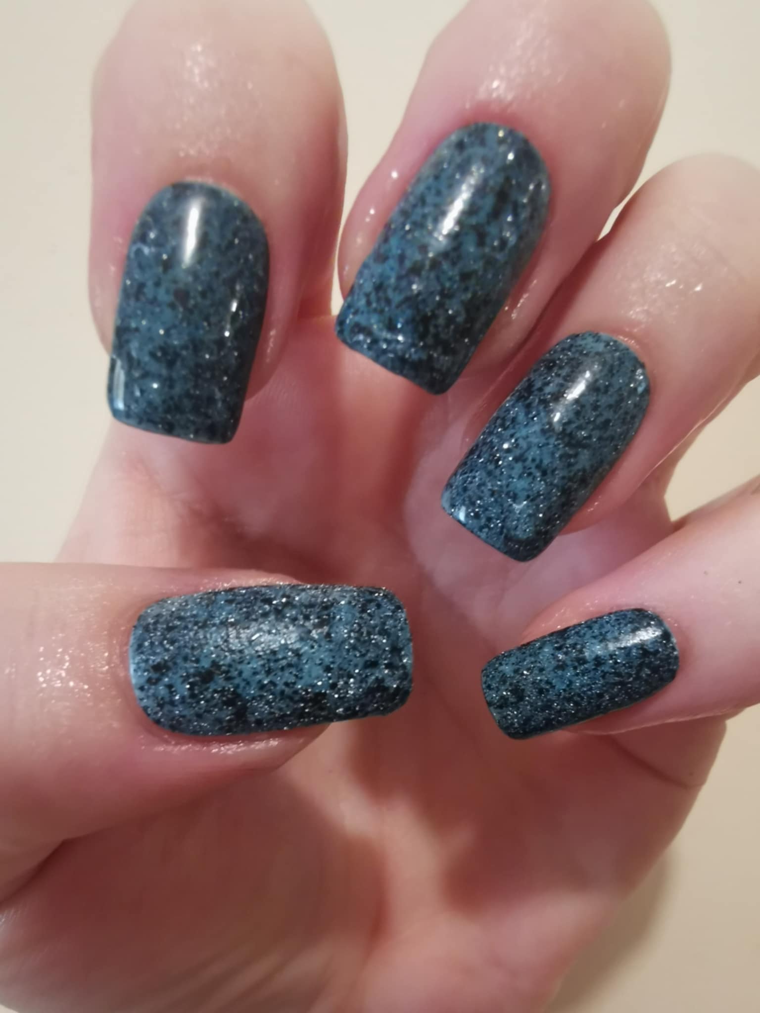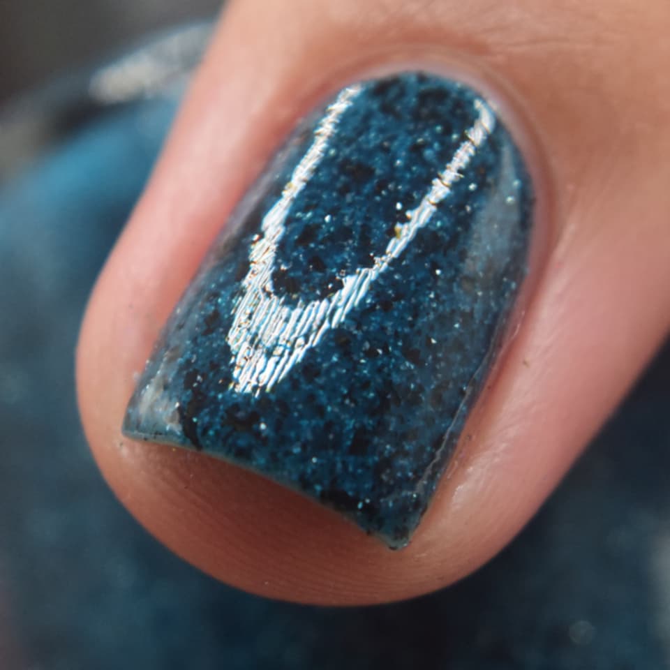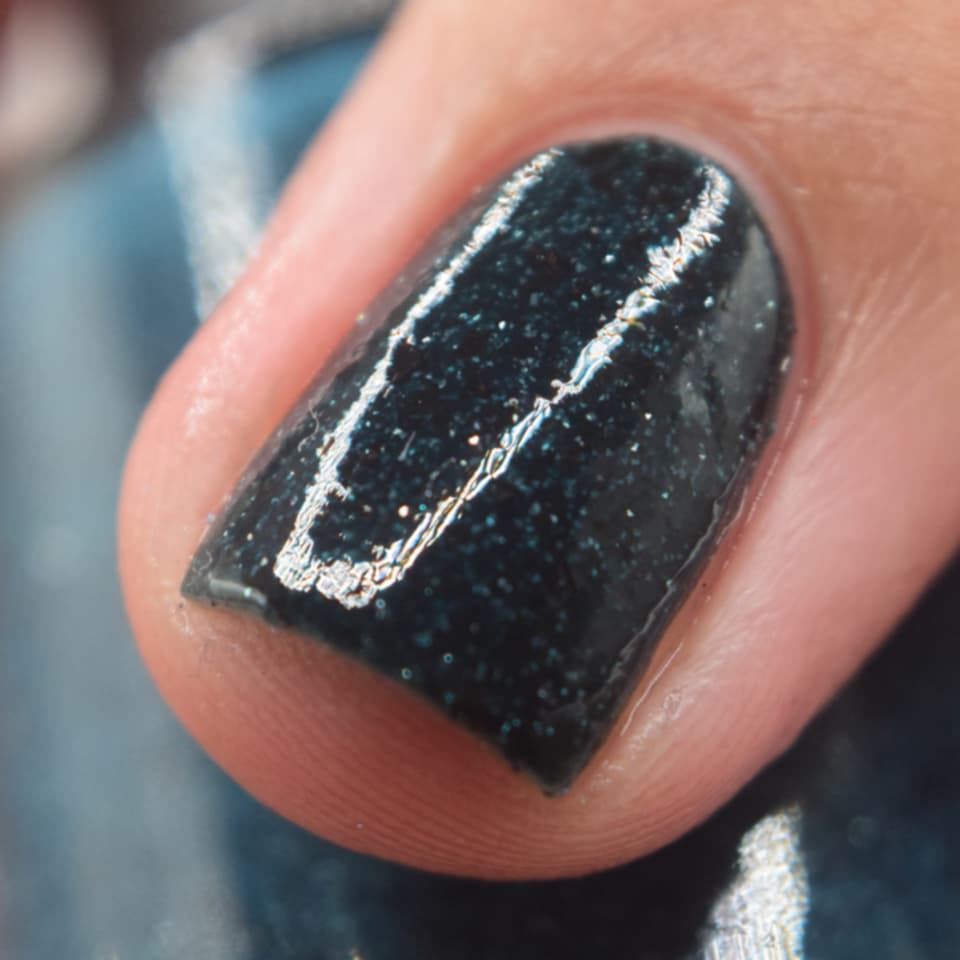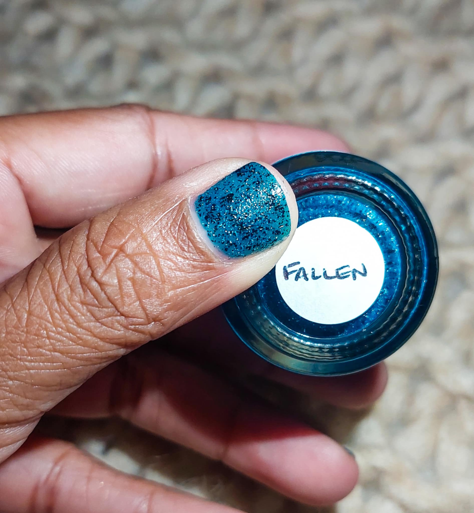 Inspired by the cover art of the Evanescence album of the same name, Fallen is a black to blue thermal polish filled with black microflakes and silver reflective glitter. It is opaque in two coats depending on nail length and application