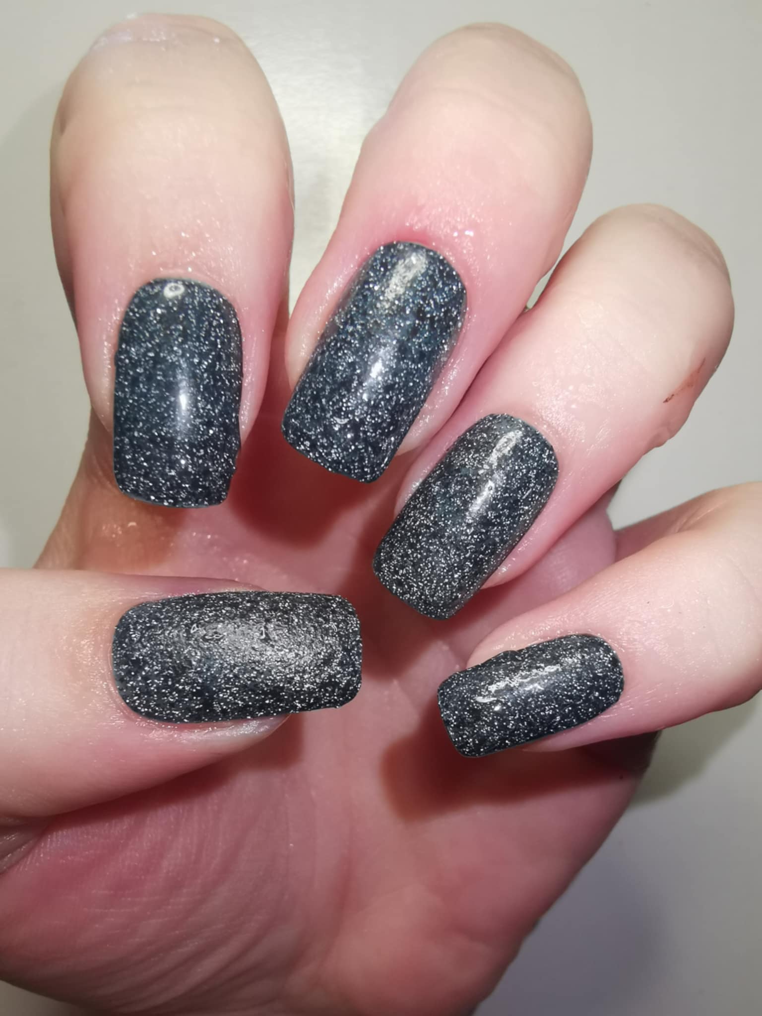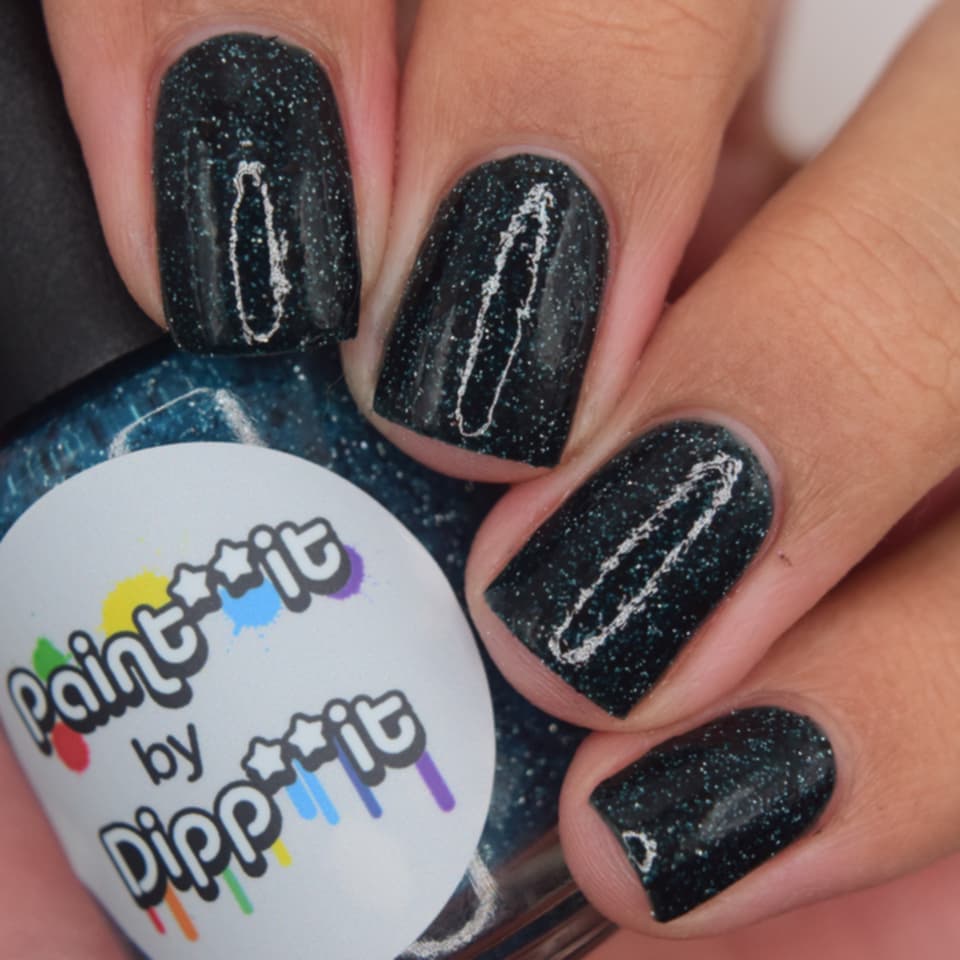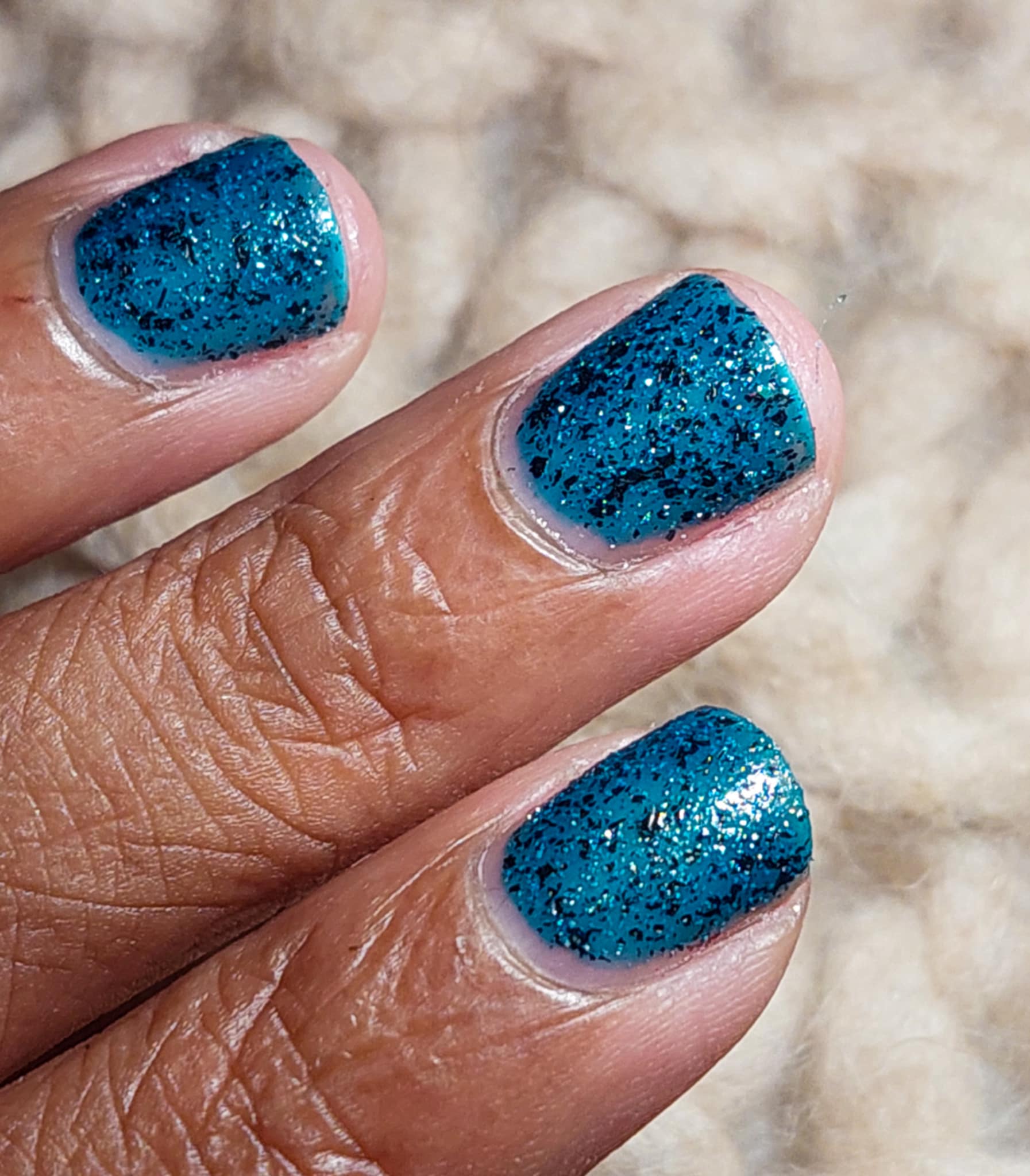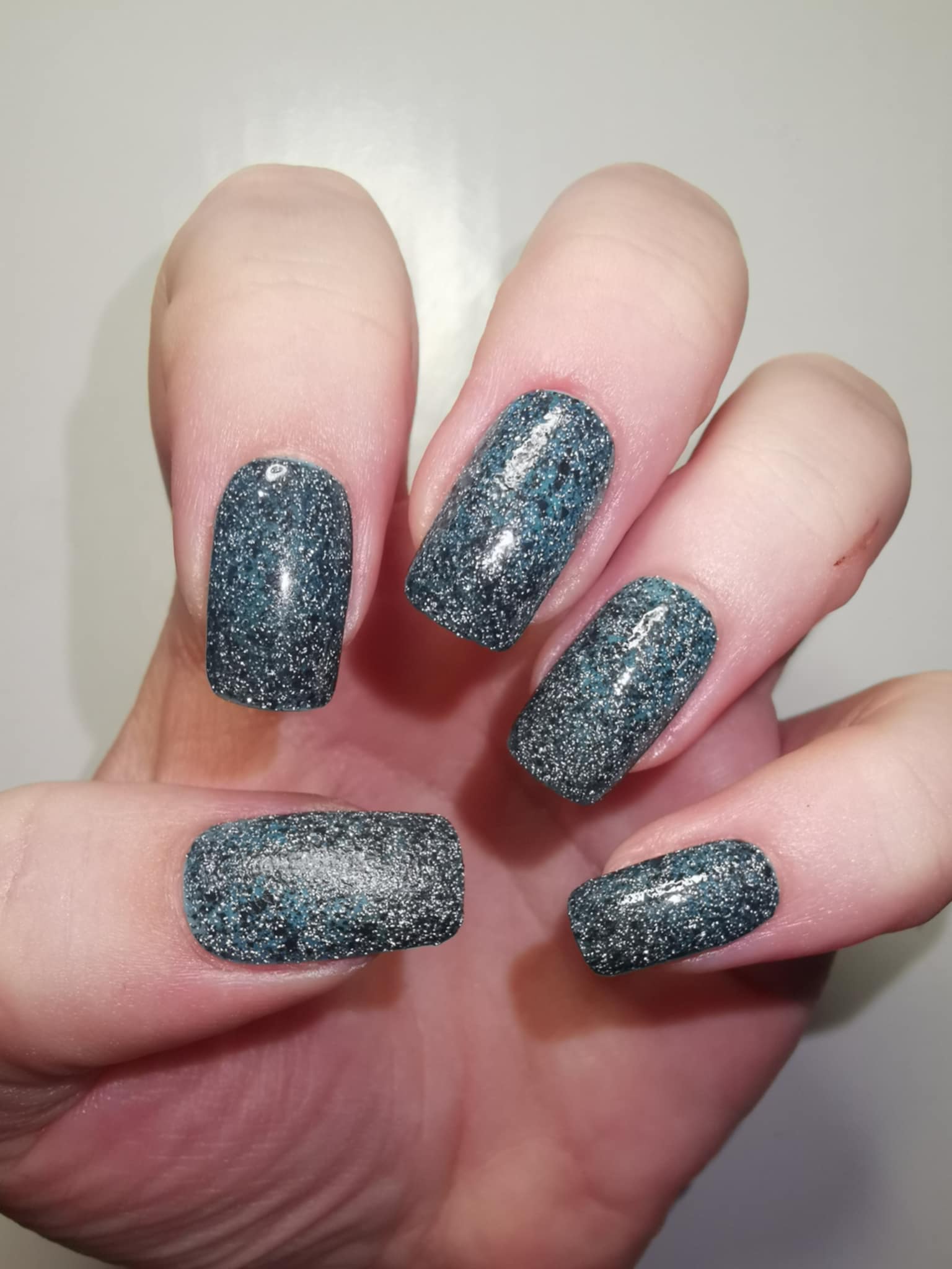 Inspired by the cover art of the Evanescence album of the same name, Fallen is a black to blue thermal polish filled with black microflakes and silver reflective glitter. It is opaque in two coats depending on nail length and application