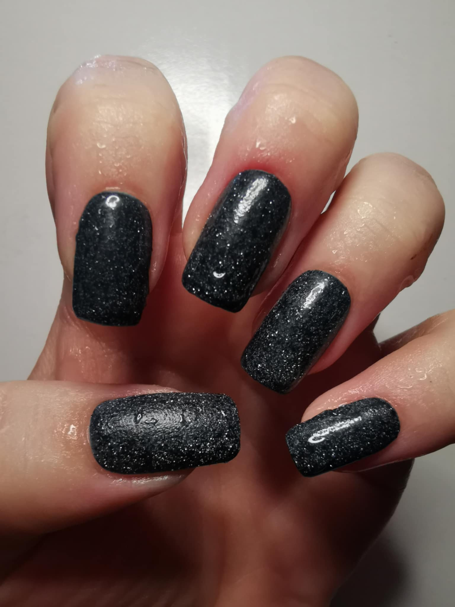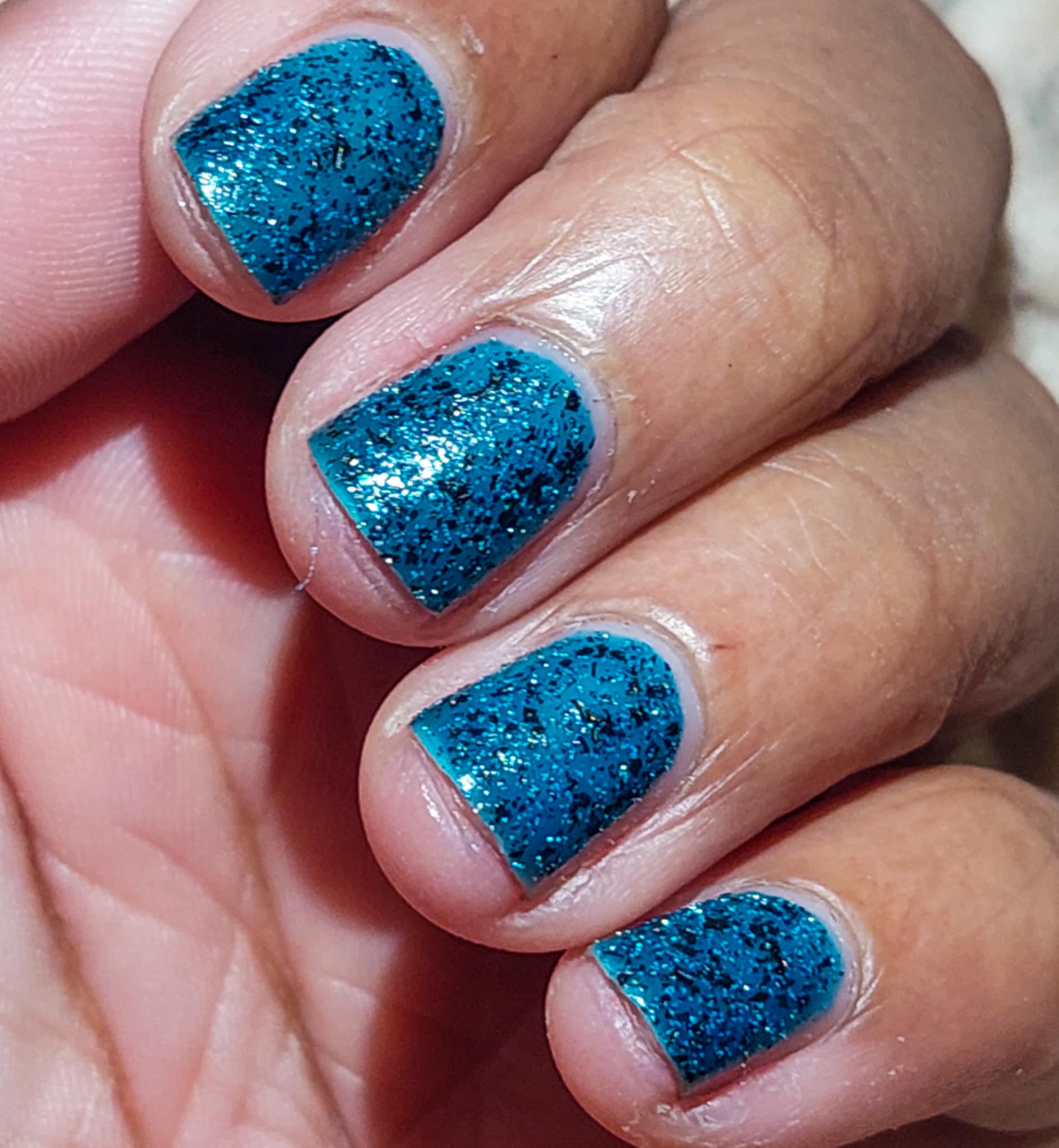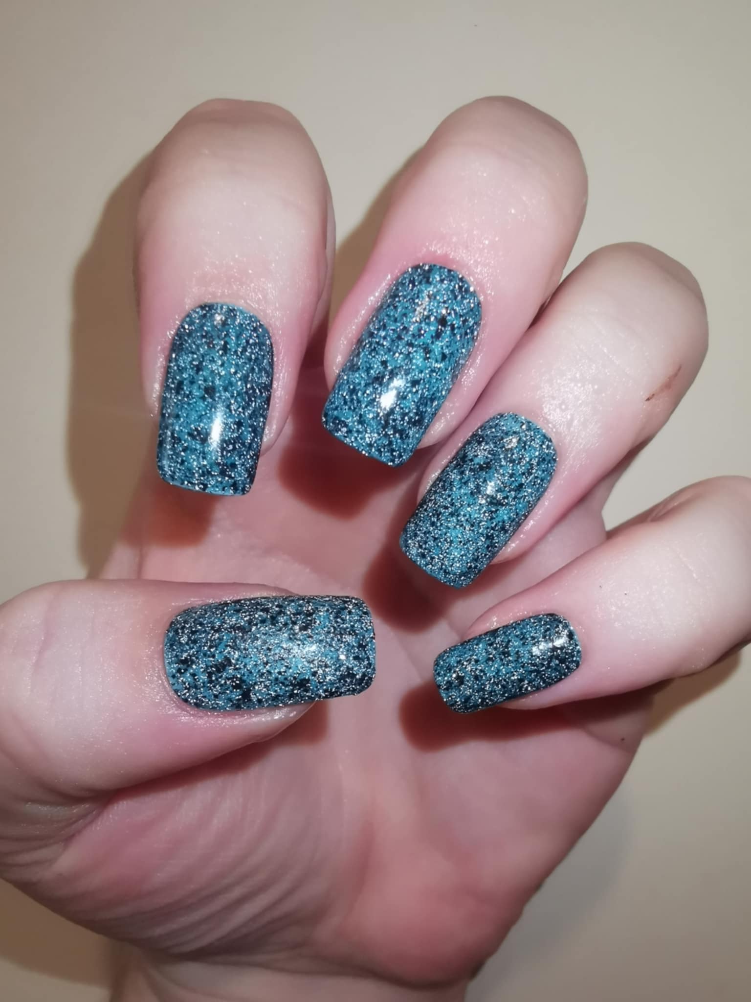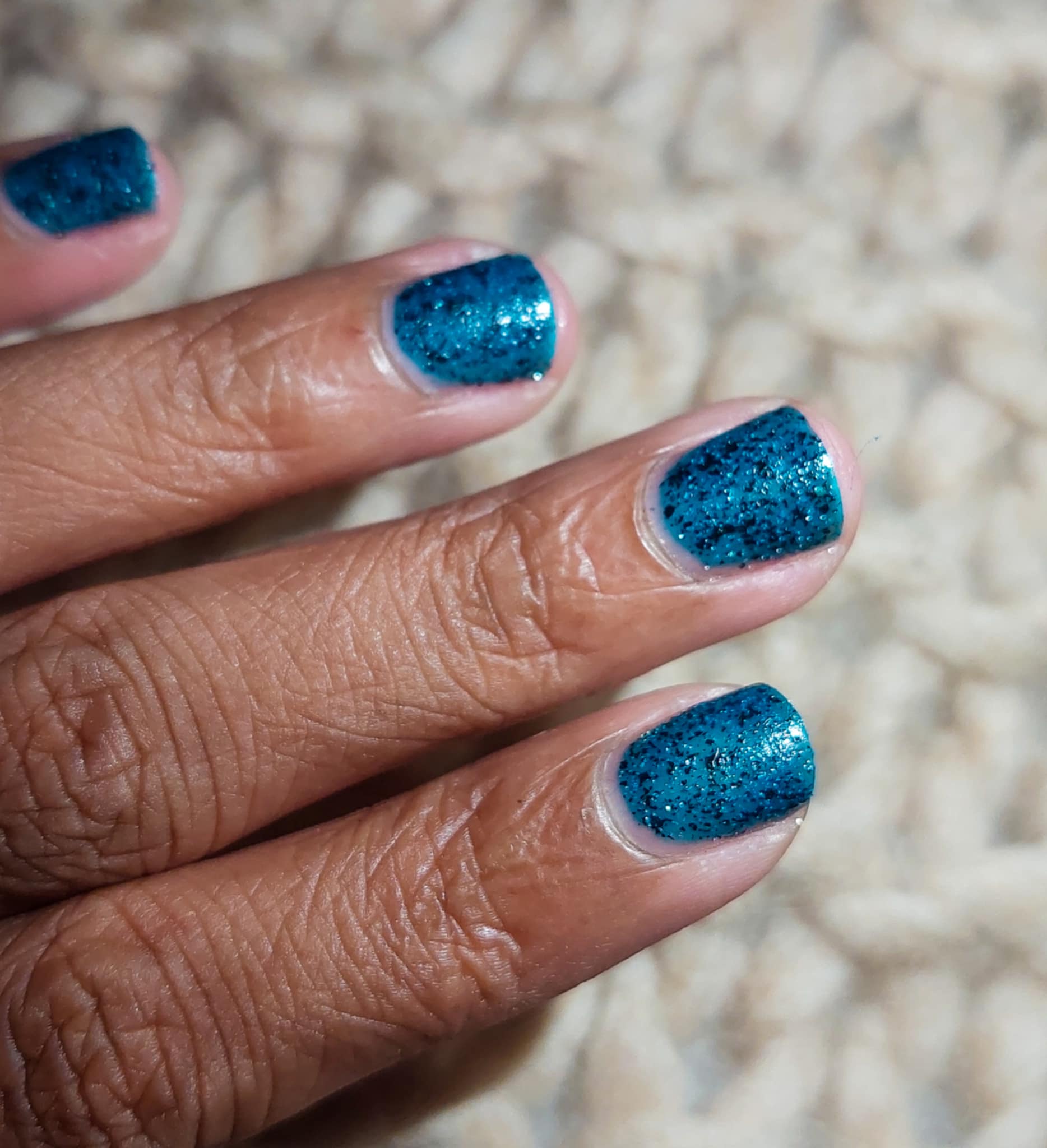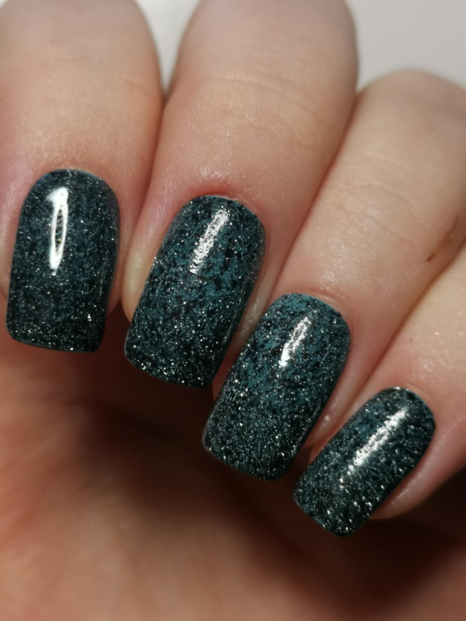 Inspired by the cover art of the Evanescence album of the same name, Fallen is a black to blue thermal polish filled with black microflakes and silver reflective glitter. It is opaque in two coats depending on nail length and application