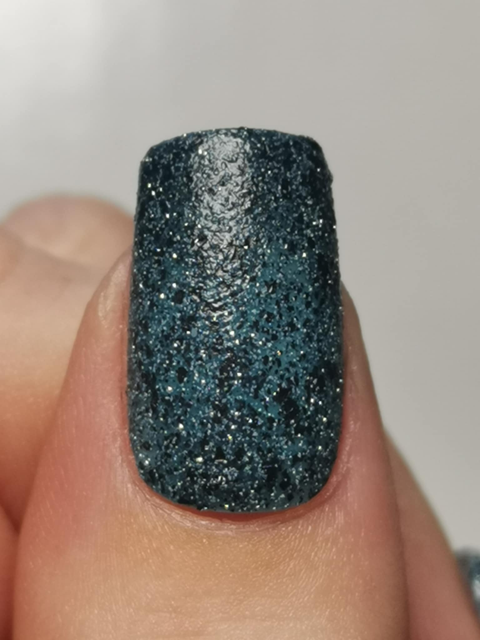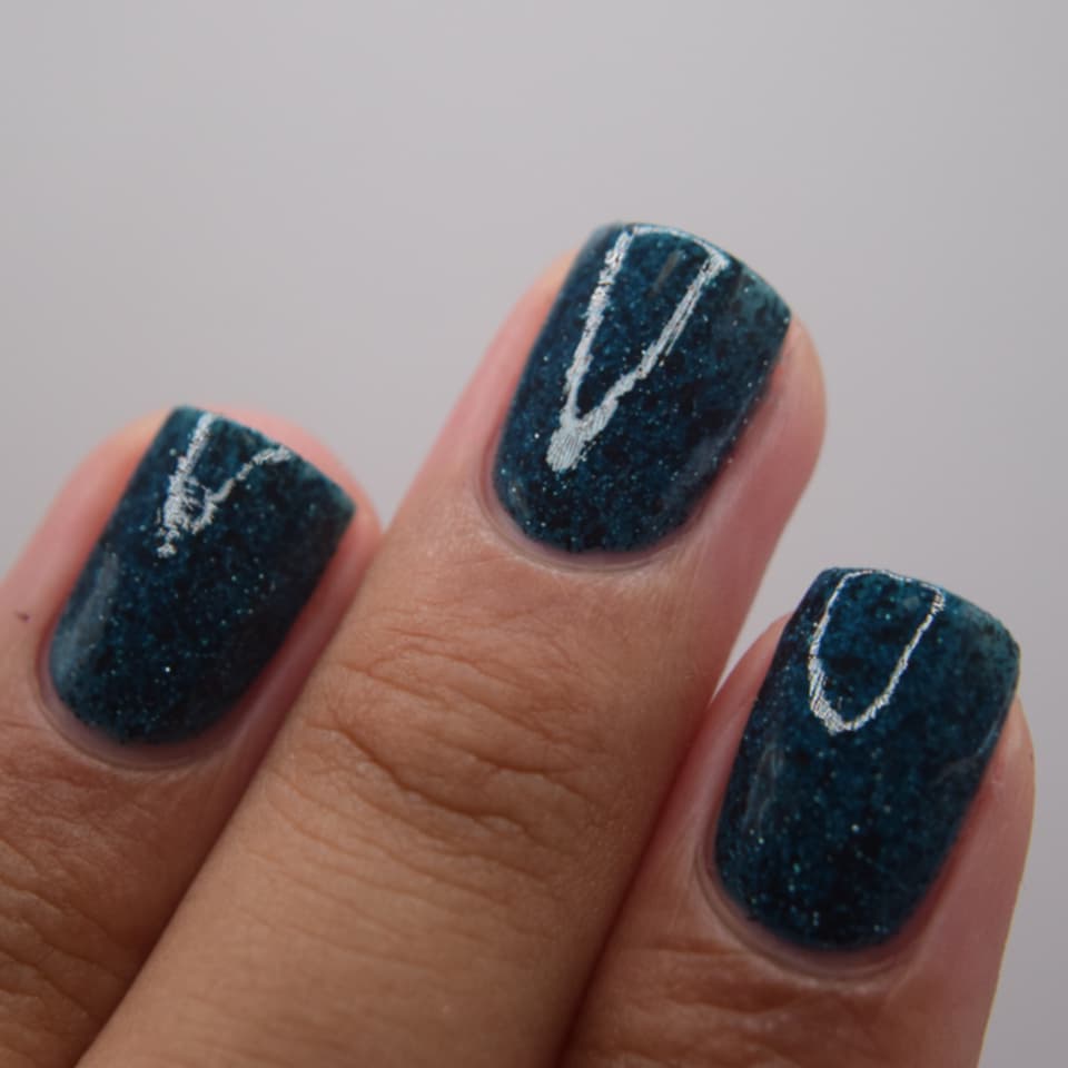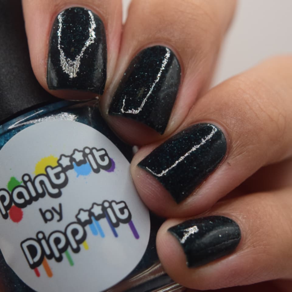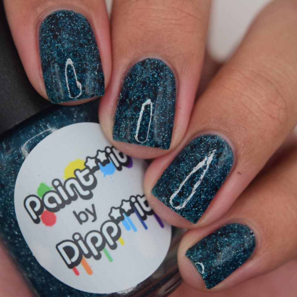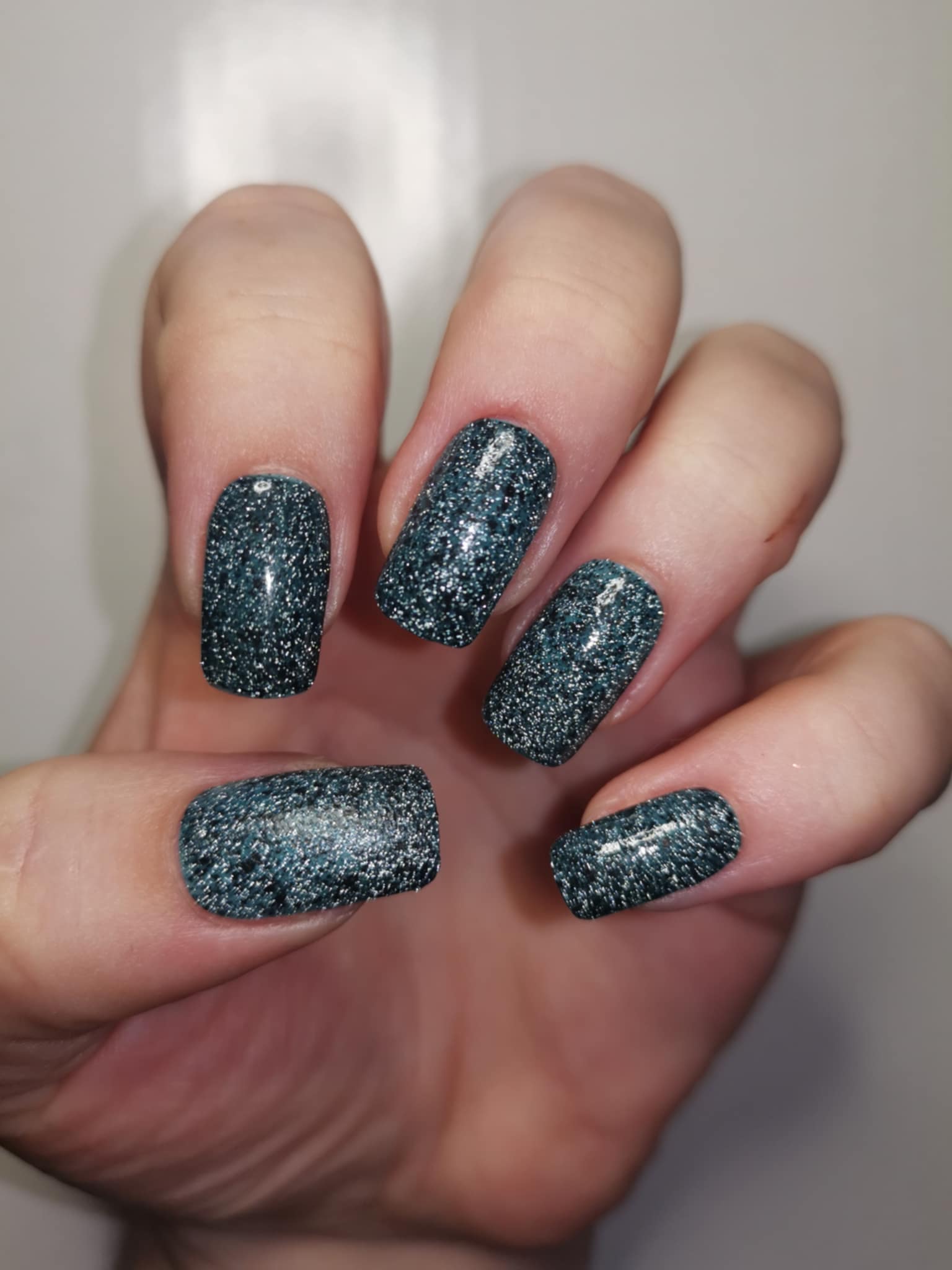 Inspired by the cover art of the Evanescence album of the same name, Fallen is a black to blue thermal polish filled with black microflakes and silver reflective glitter. It is opaque in two coats depending on nail length and application