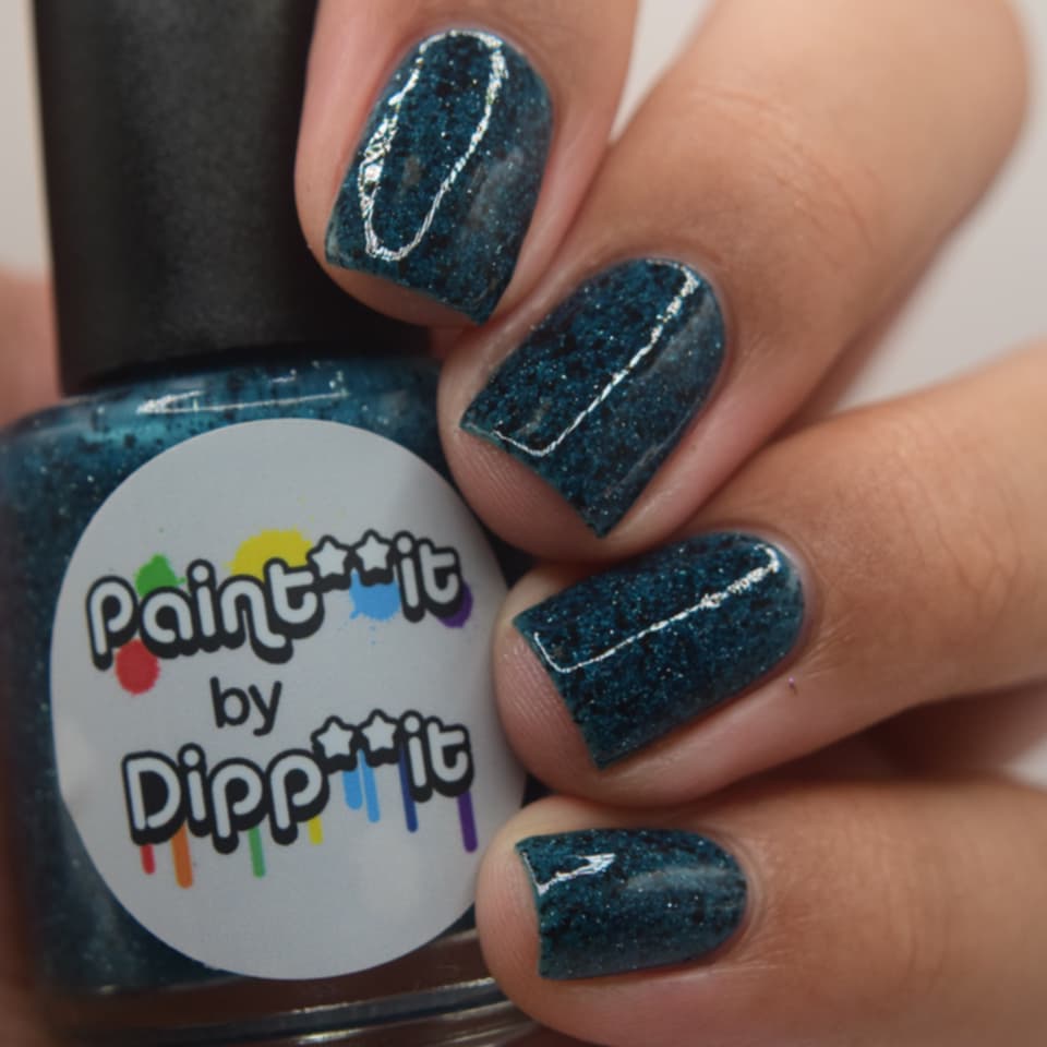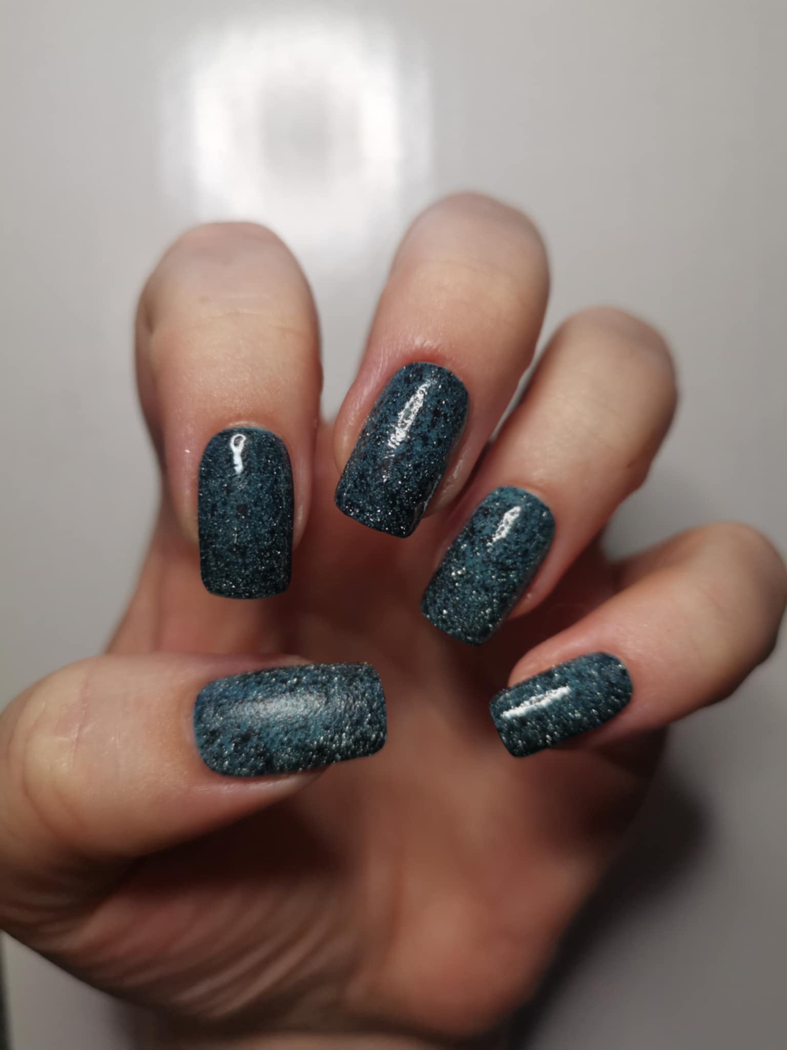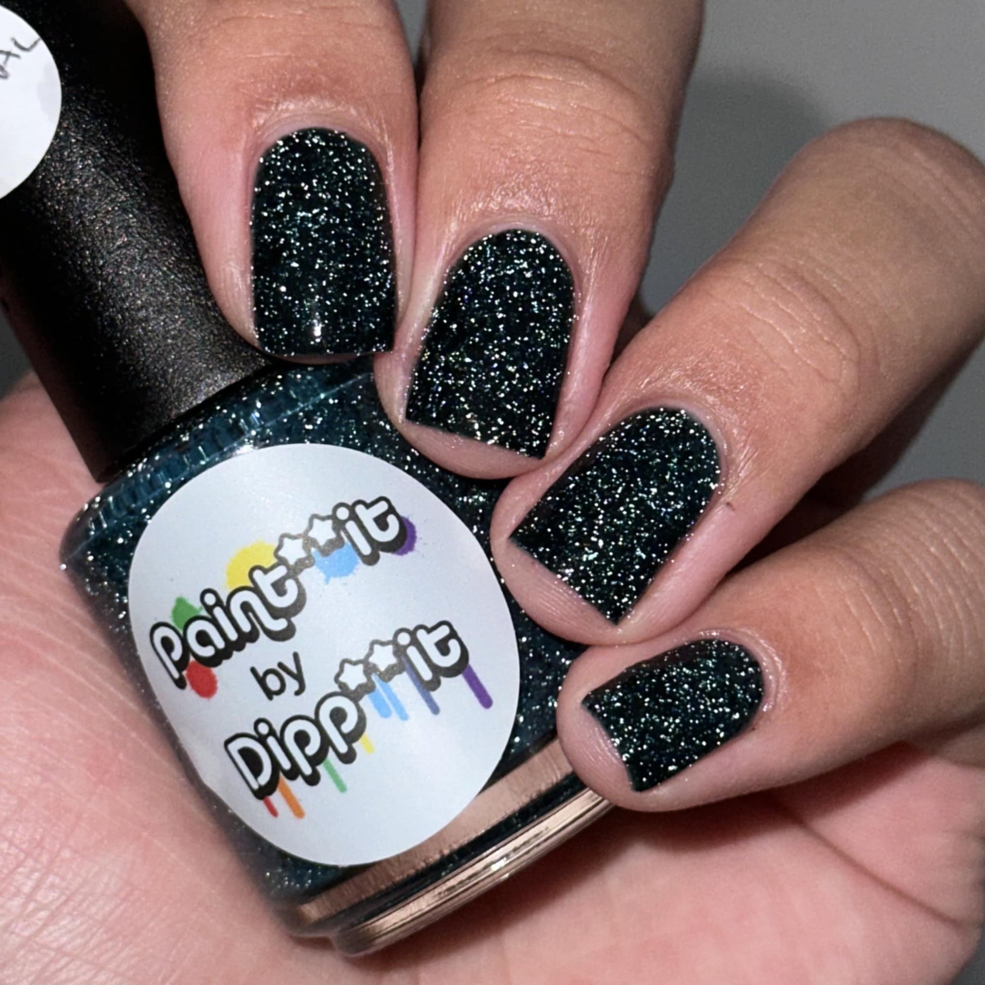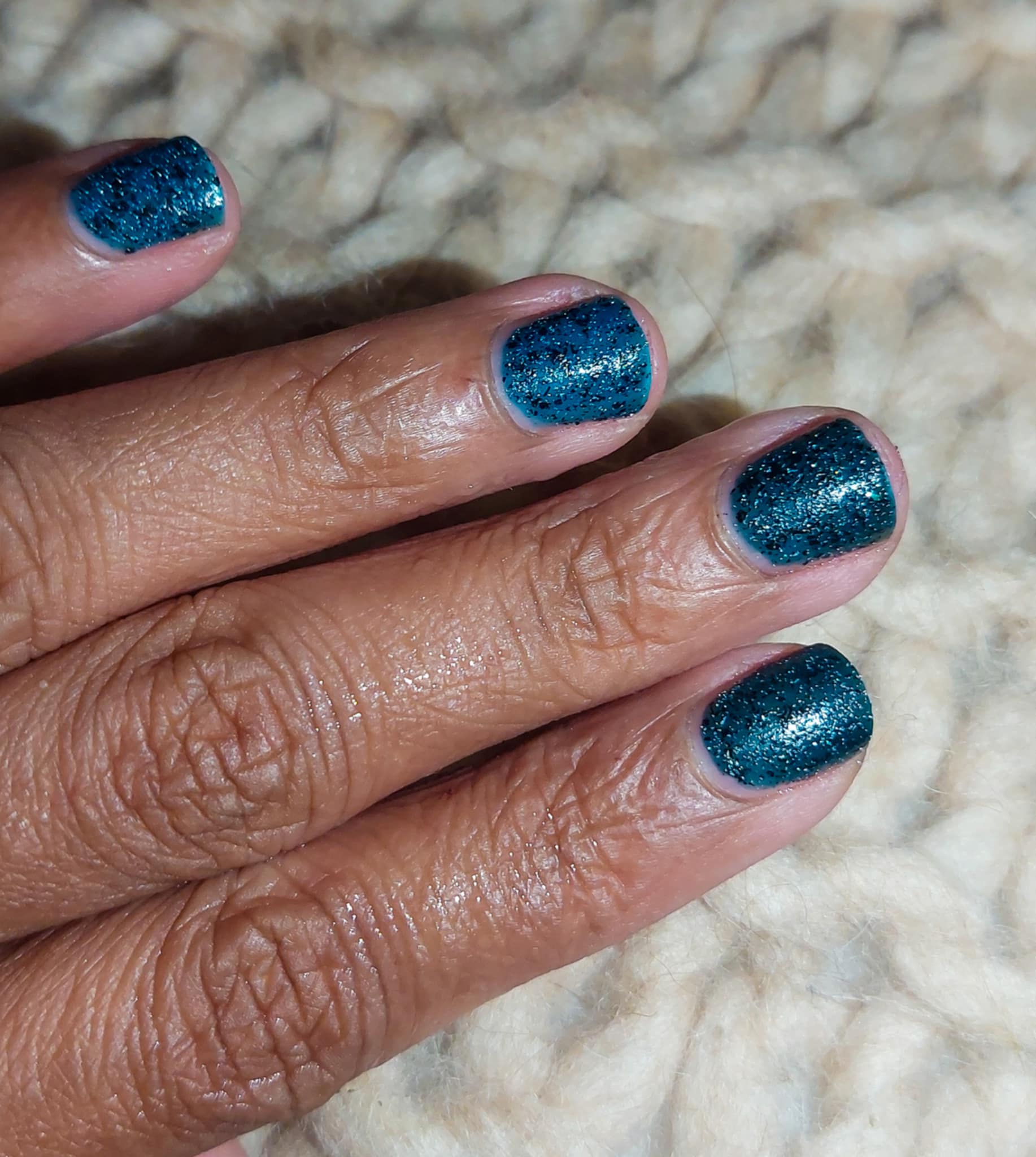 Inspired by the cover art of the Evanescence album of the same name, Fallen is a black to blue thermal polish filled with black microflakes and silver reflective glitter. It is opaque in two coats depending on nail length and application