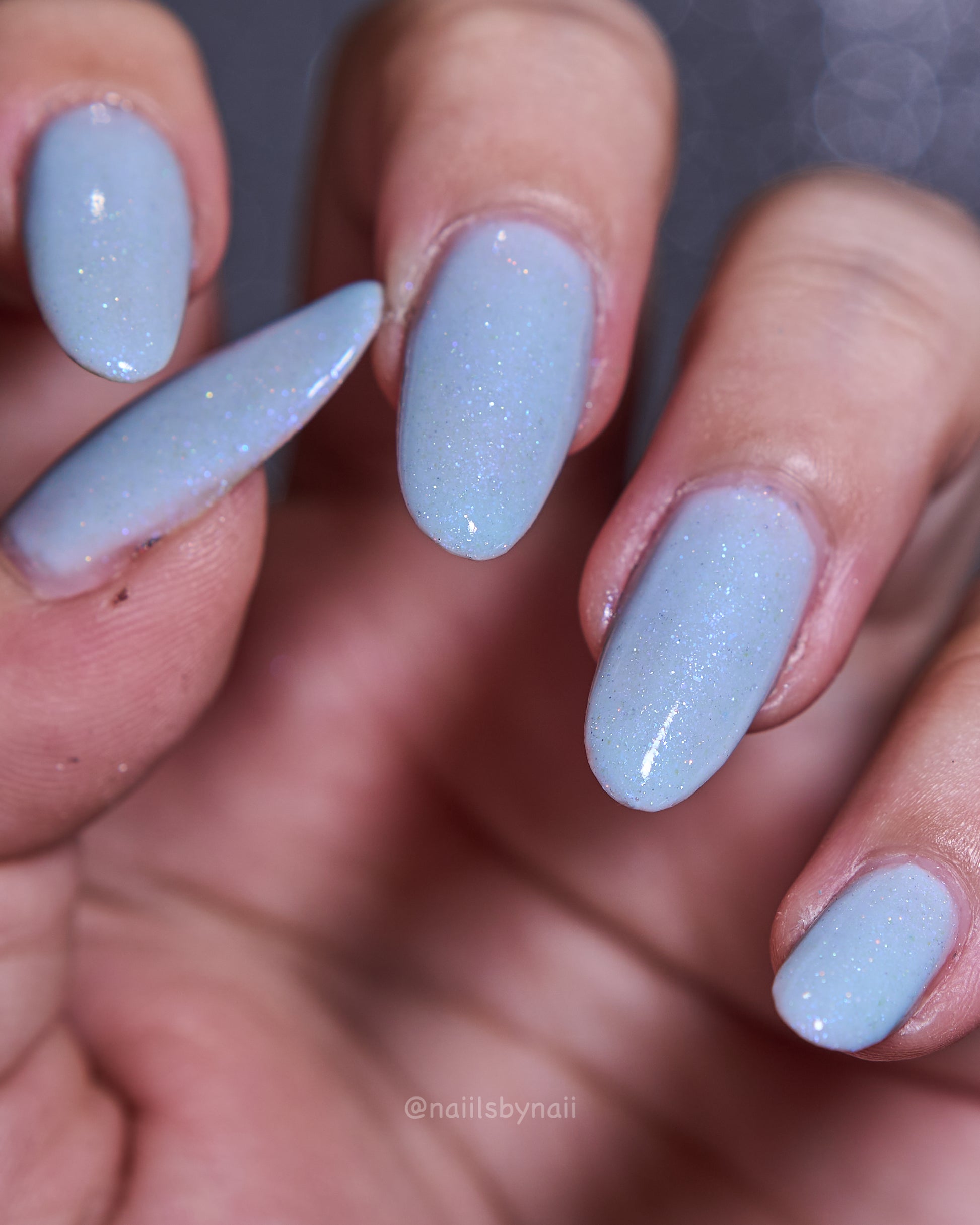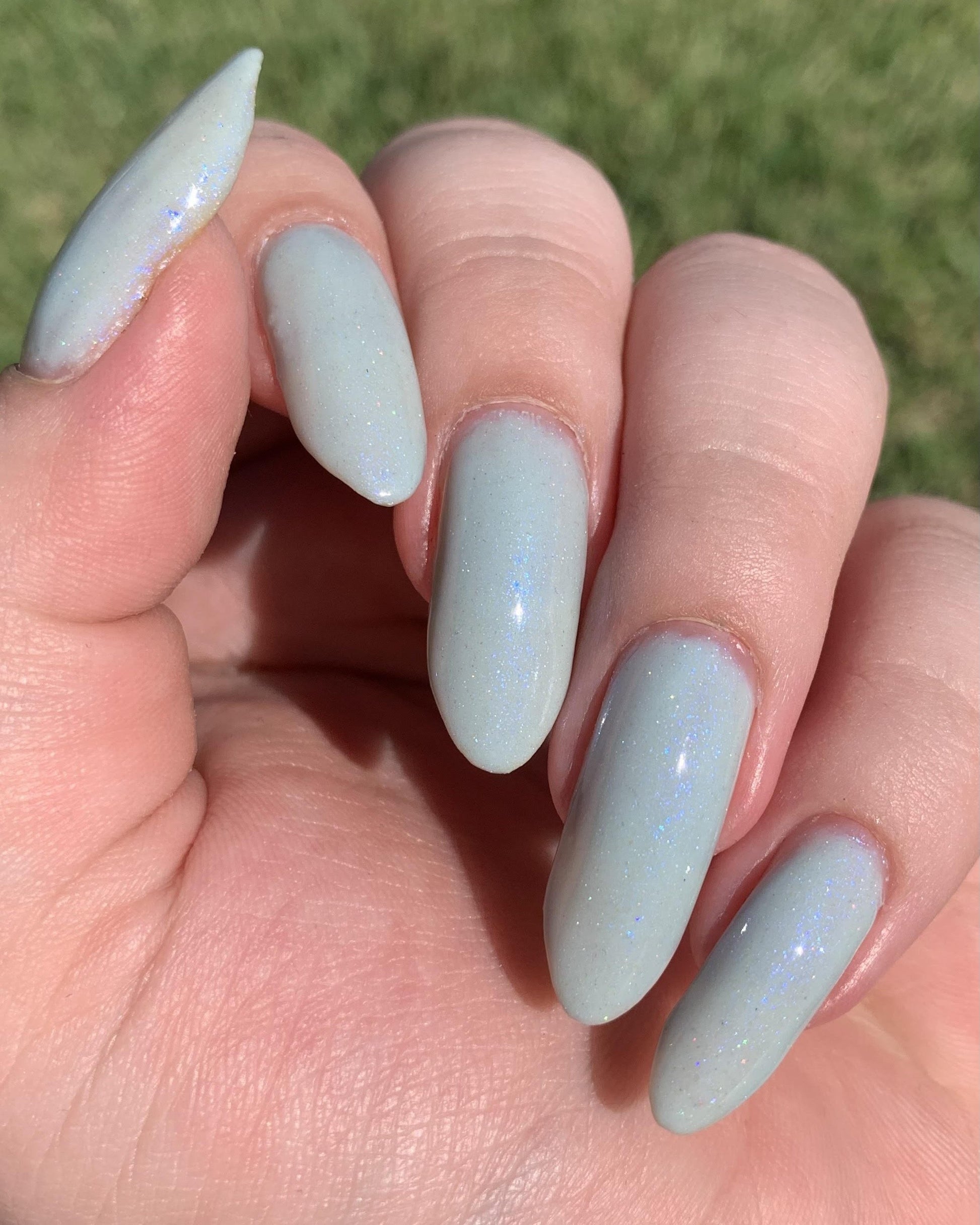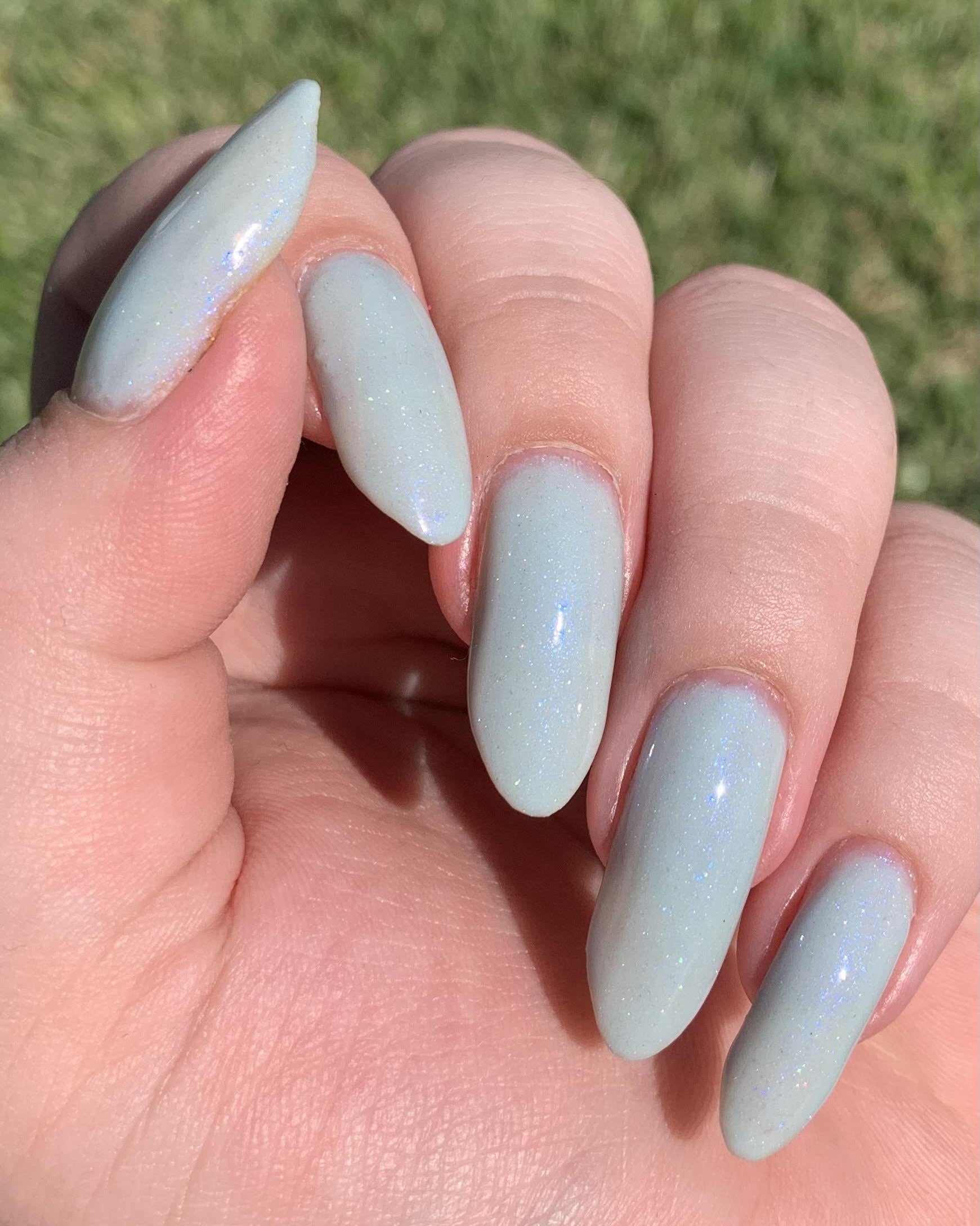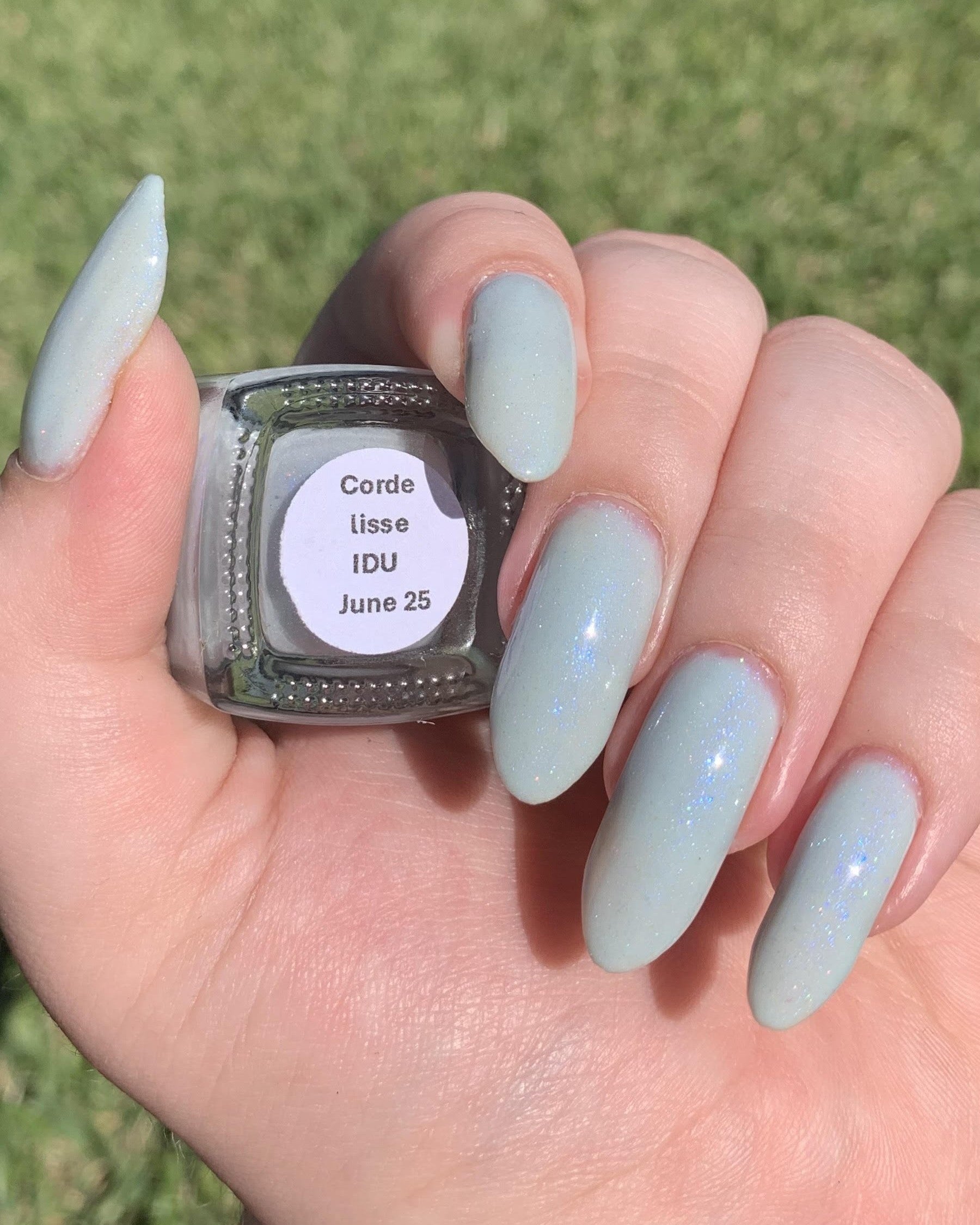 Description: Corde Lisse (pronounced cord-lee-suh) is inspired by the sky-dancing elegance of aerial rope performers. A delicate light blue crelly base sets the stage for a soft blue-to-purple shimmer and a scattering of silver holo sparkle—like silk and starlight spun mid-air.