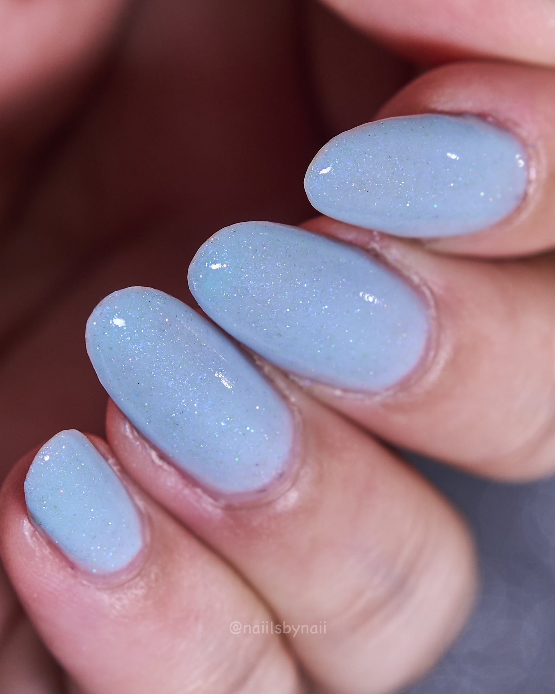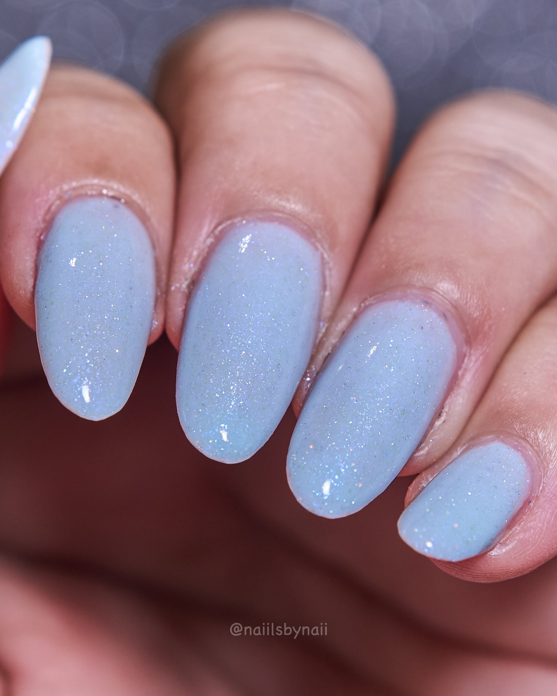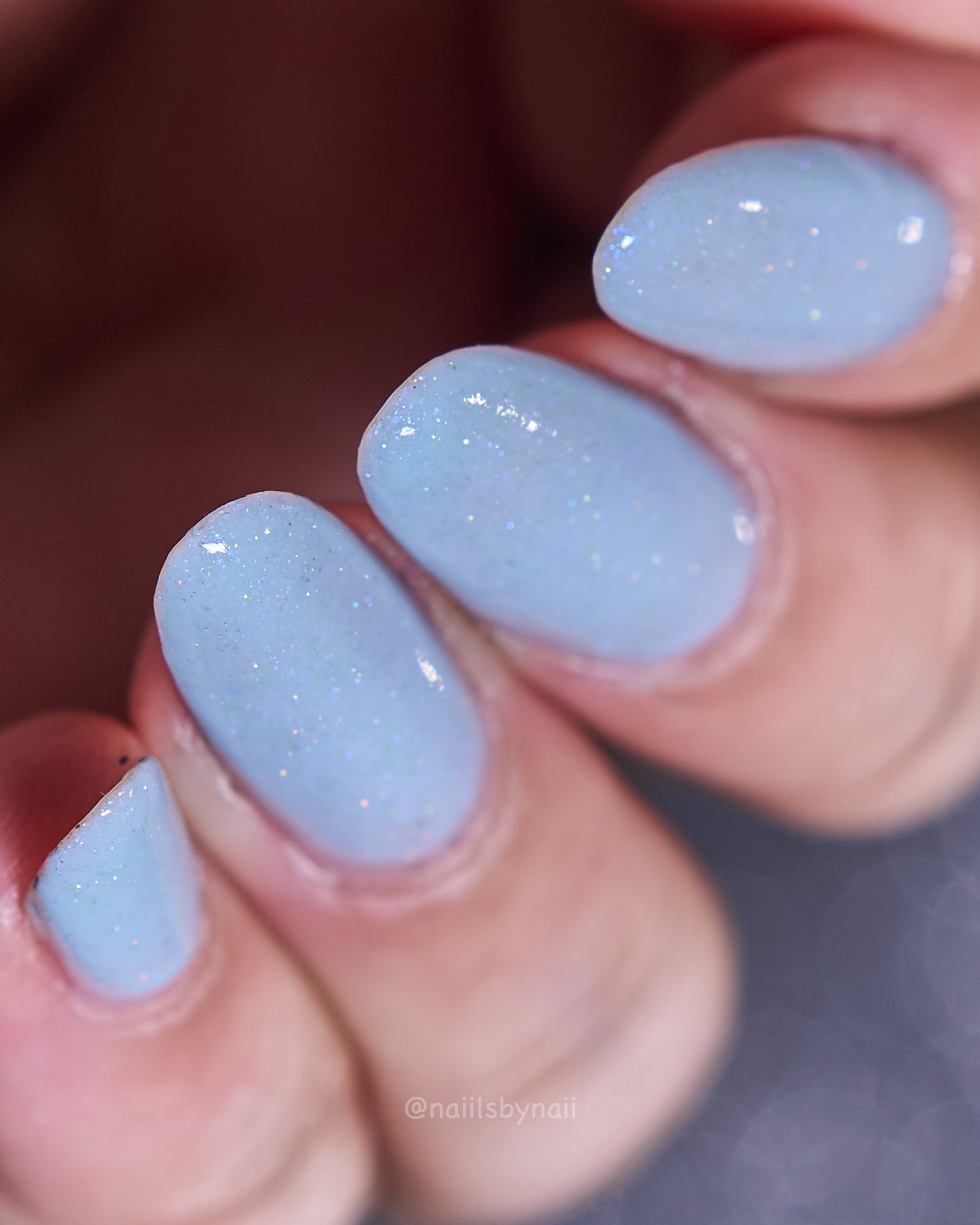 Description: Corde Lisse (pronounced cord-lee-suh) is inspired by the sky-dancing elegance of aerial rope performers. A delicate light blue crelly base sets the stage for a soft blue-to-purple shimmer and a scattering of silver holo sparkle—like silk and starlight spun mid-air.