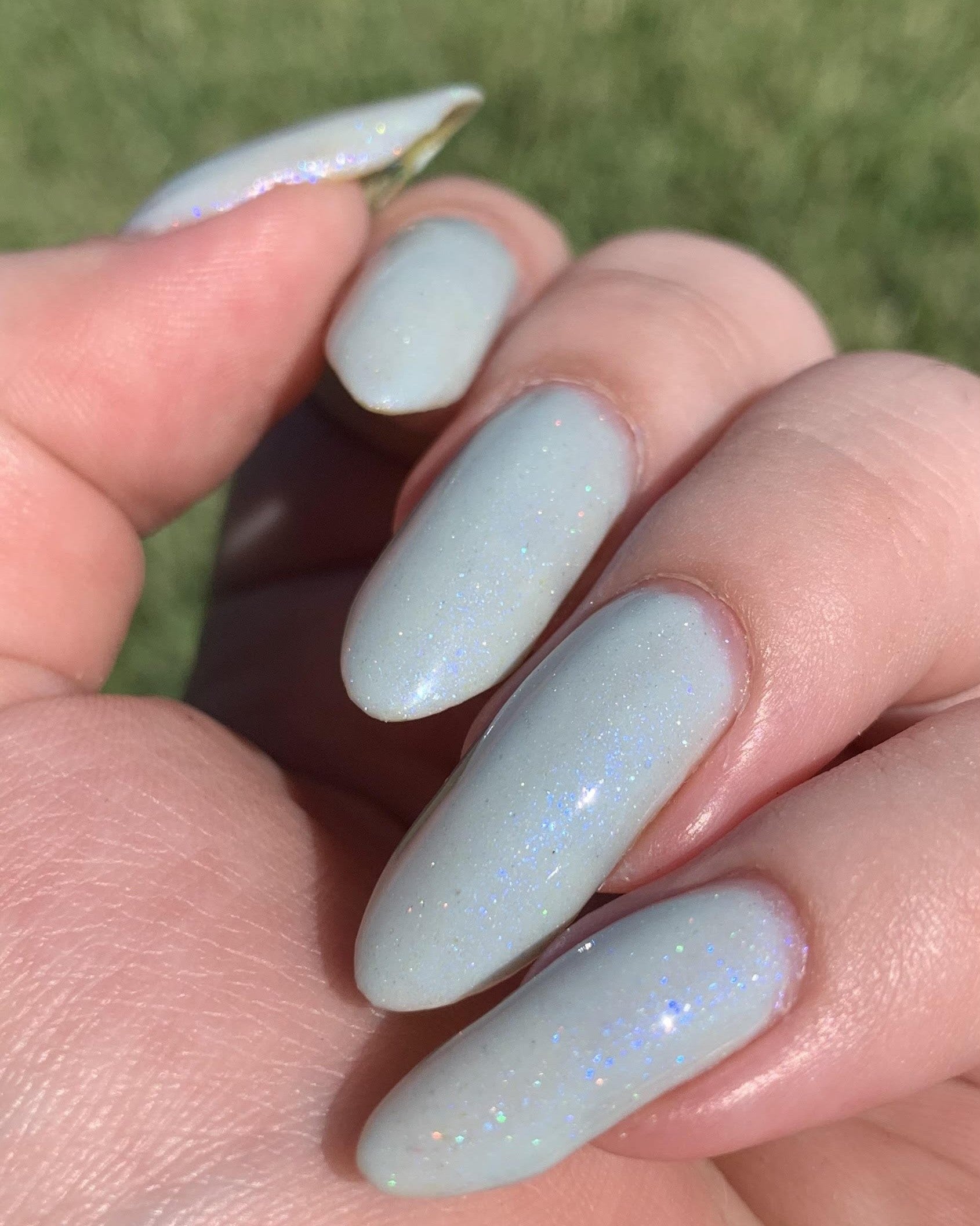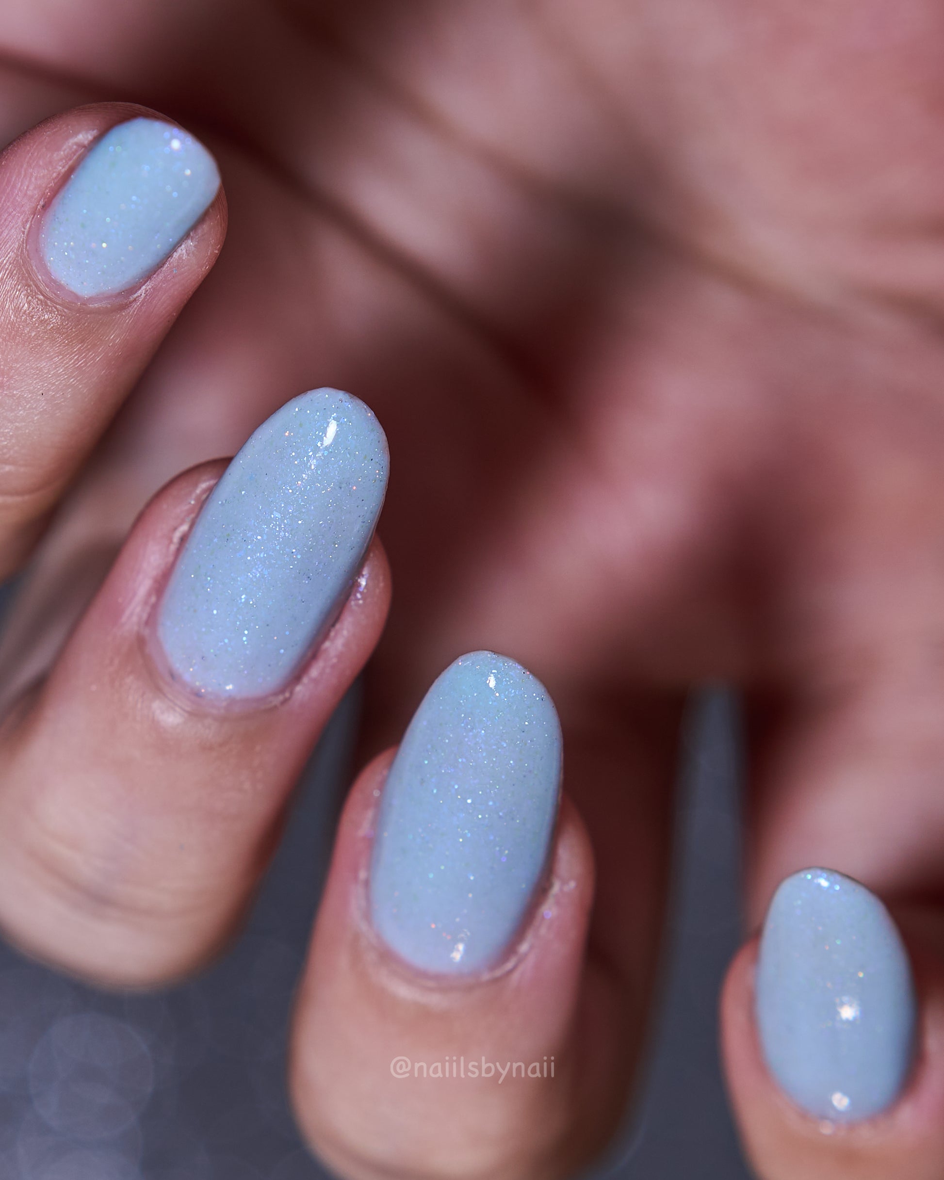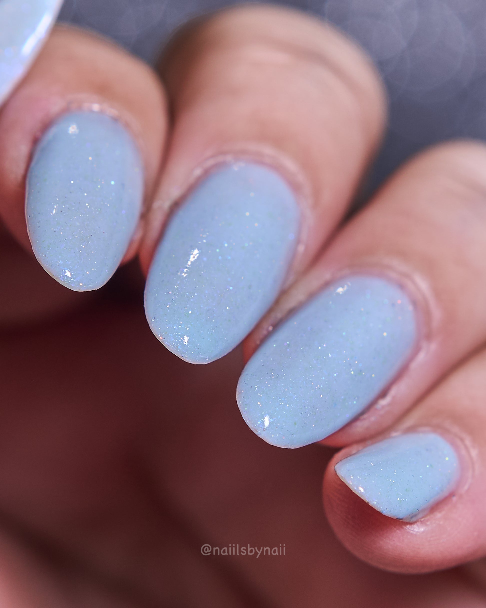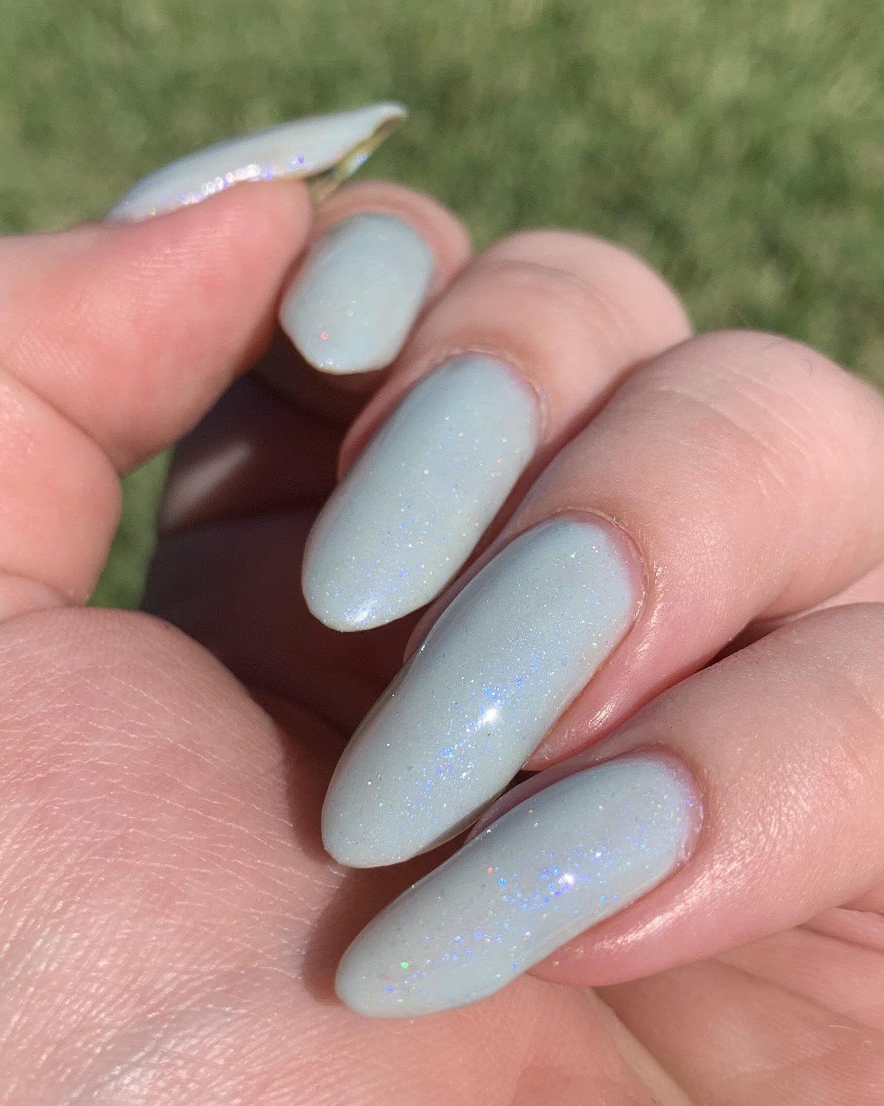Description: Corde Lisse (pronounced cord-lee-suh) is inspired by the sky-dancing elegance of aerial rope performers. A delicate light blue crelly base sets the stage for a soft blue-to-purple shimmer and a scattering of silver holo sparkle—like silk and starlight spun mid-air.