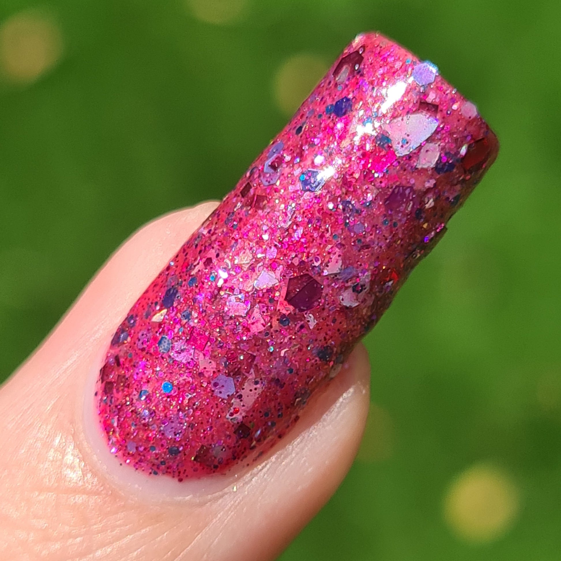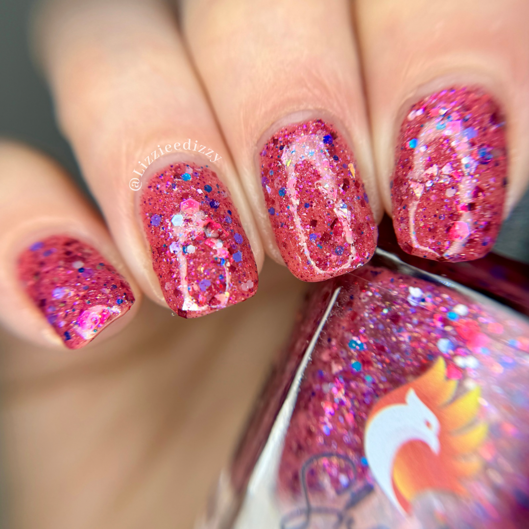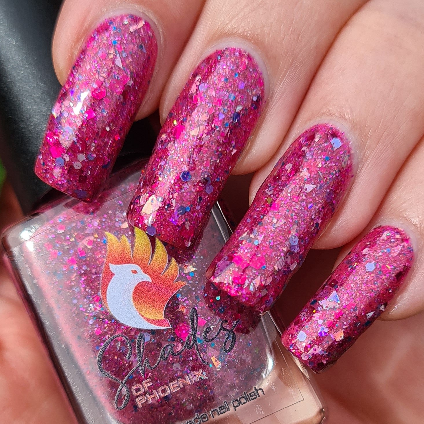 Toxic Allure - Experience the captivating charm of Toxic Allure, a mauve pink crelly nail polish adorned with a dazzling blend of silver holo shreds, chrome pink flakes, and rose gold micro flakies. Hot pink flakes, magenta blue micro flakies, and holo pink and lavender glitters add vibrant pops of color, while purple-blue iridescent shreds create a stunning, color-shifting effect.