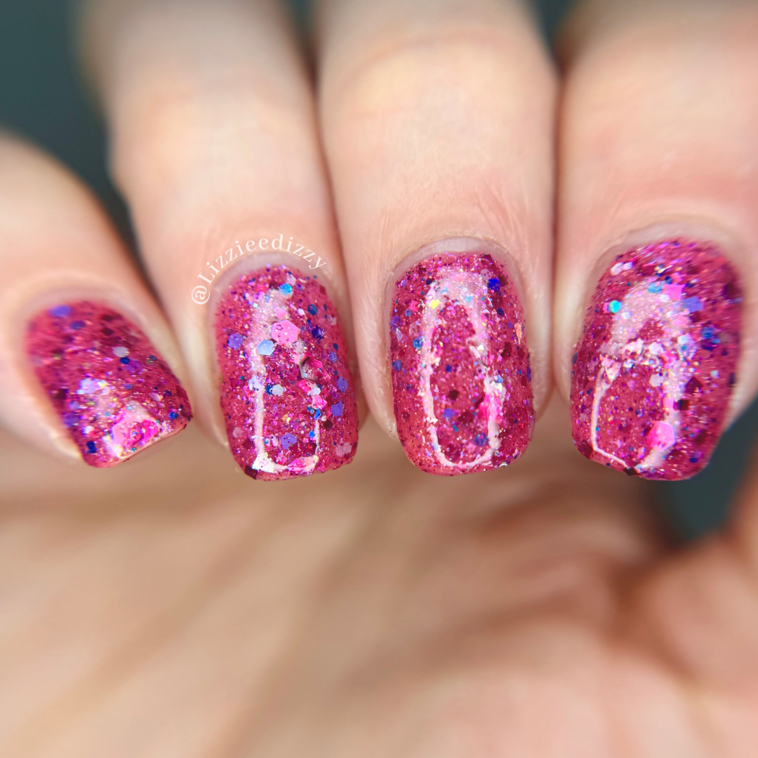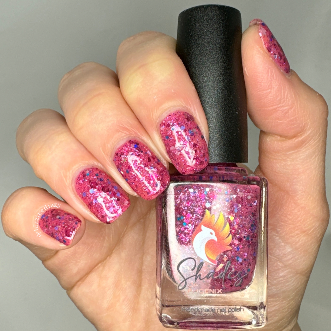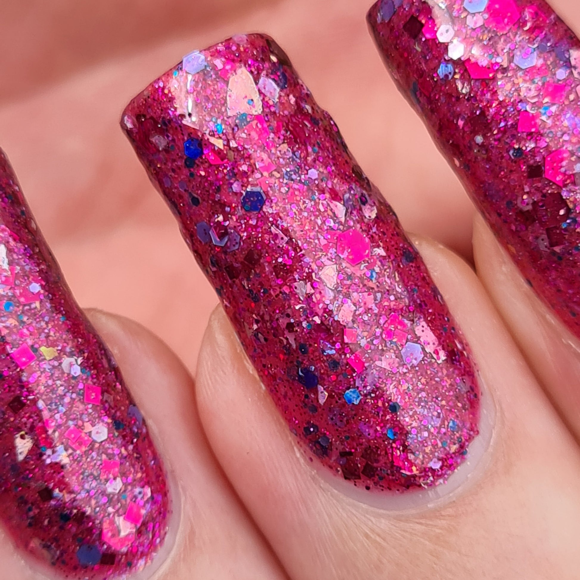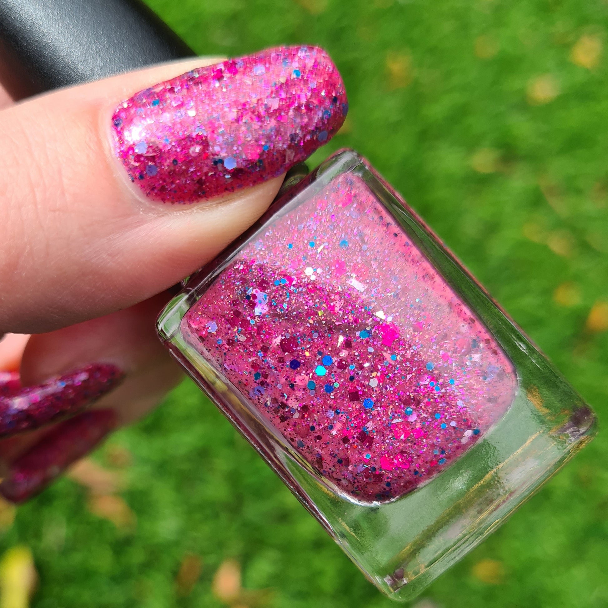 Toxic Allure - Experience the captivating charm of Toxic Allure, a mauve pink crelly nail polish adorned with a dazzling blend of silver holo shreds, chrome pink flakes, and rose gold micro flakies. Hot pink flakes, magenta blue micro flakies, and holo pink and lavender glitters add vibrant pops of color, while purple-blue iridescent shreds create a stunning, color-shifting effect.
